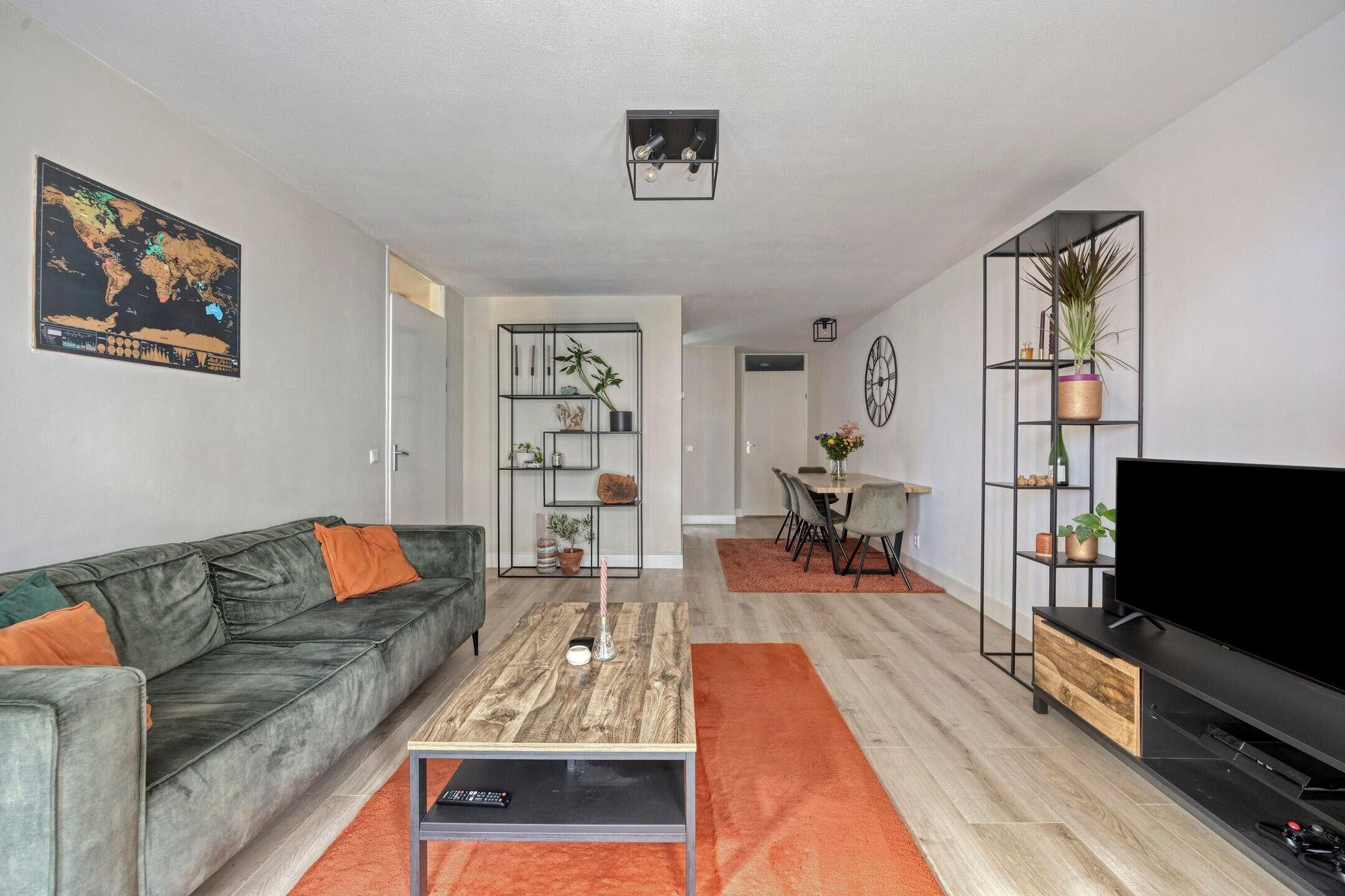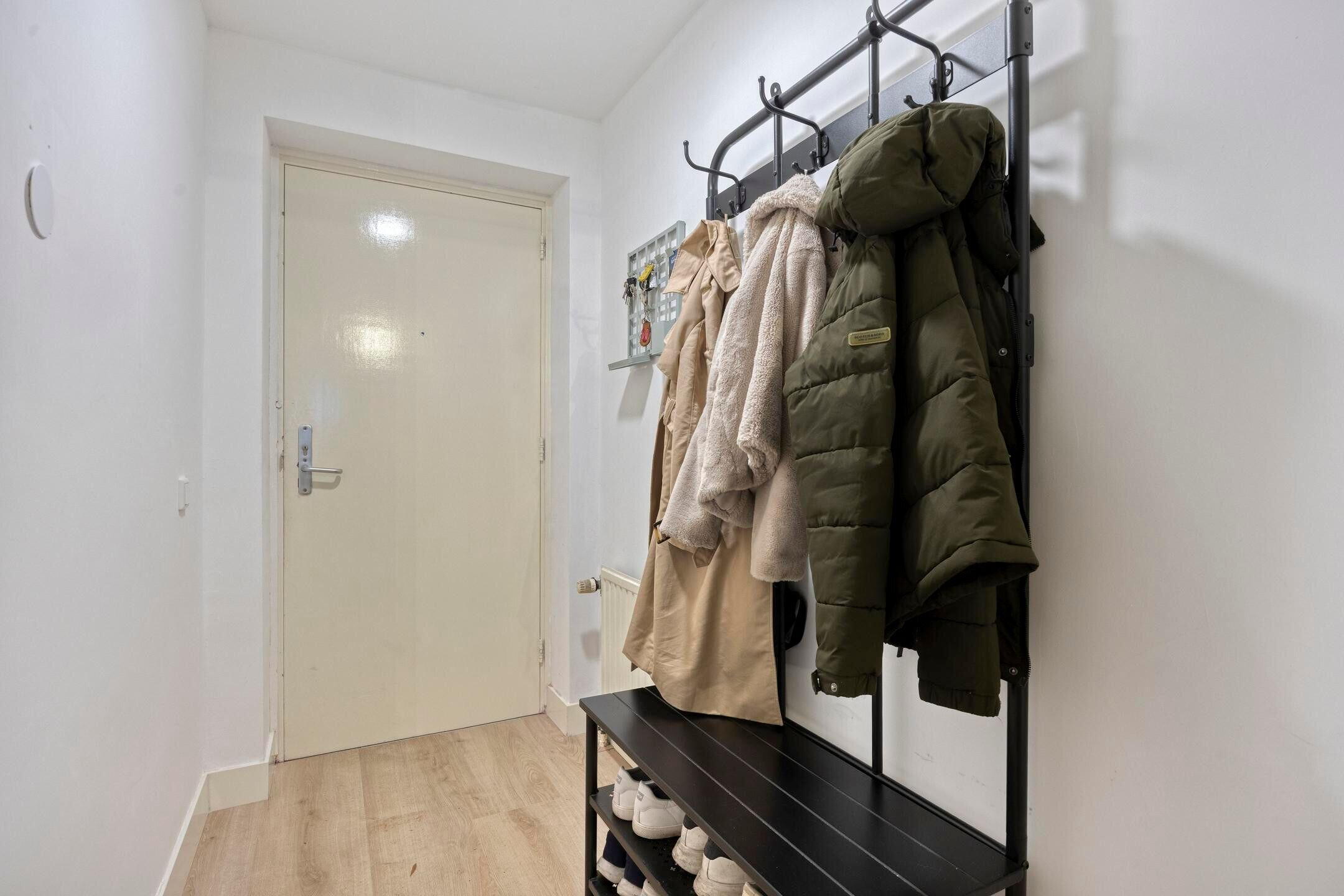 In de hal ligt, net als in bijna het hele appartement, een houtlook pvc-vloer. Aansluitend is de speels ingedeelde woon-/eetkamer, met het zitgedeelte aan de zonnige zuidkant en openslaande deuren naar het balkon. Voor een lekkere (hoek)bank, een tv-meubel en de eettafel is genoeg plek in deze woonkamer.