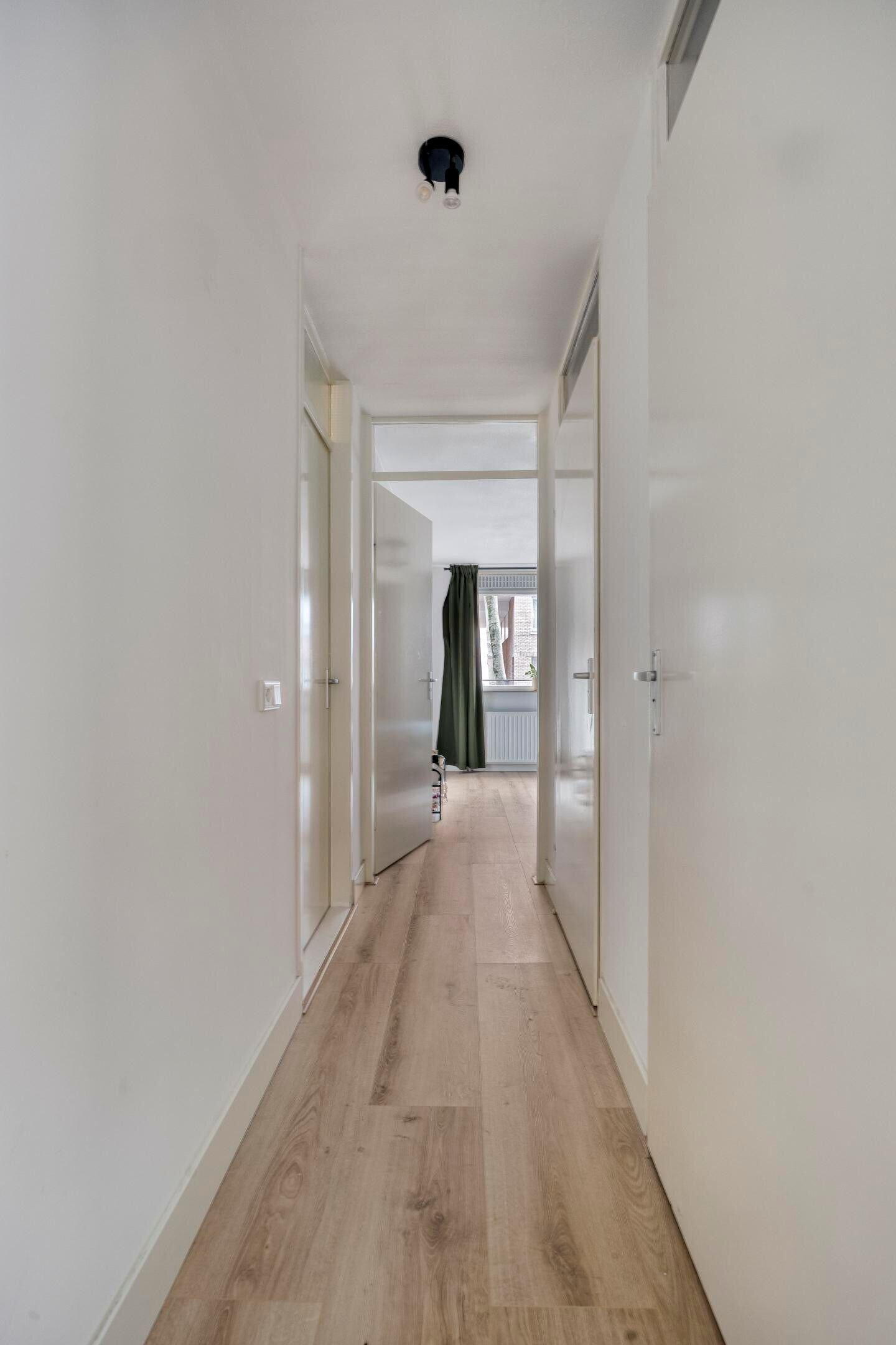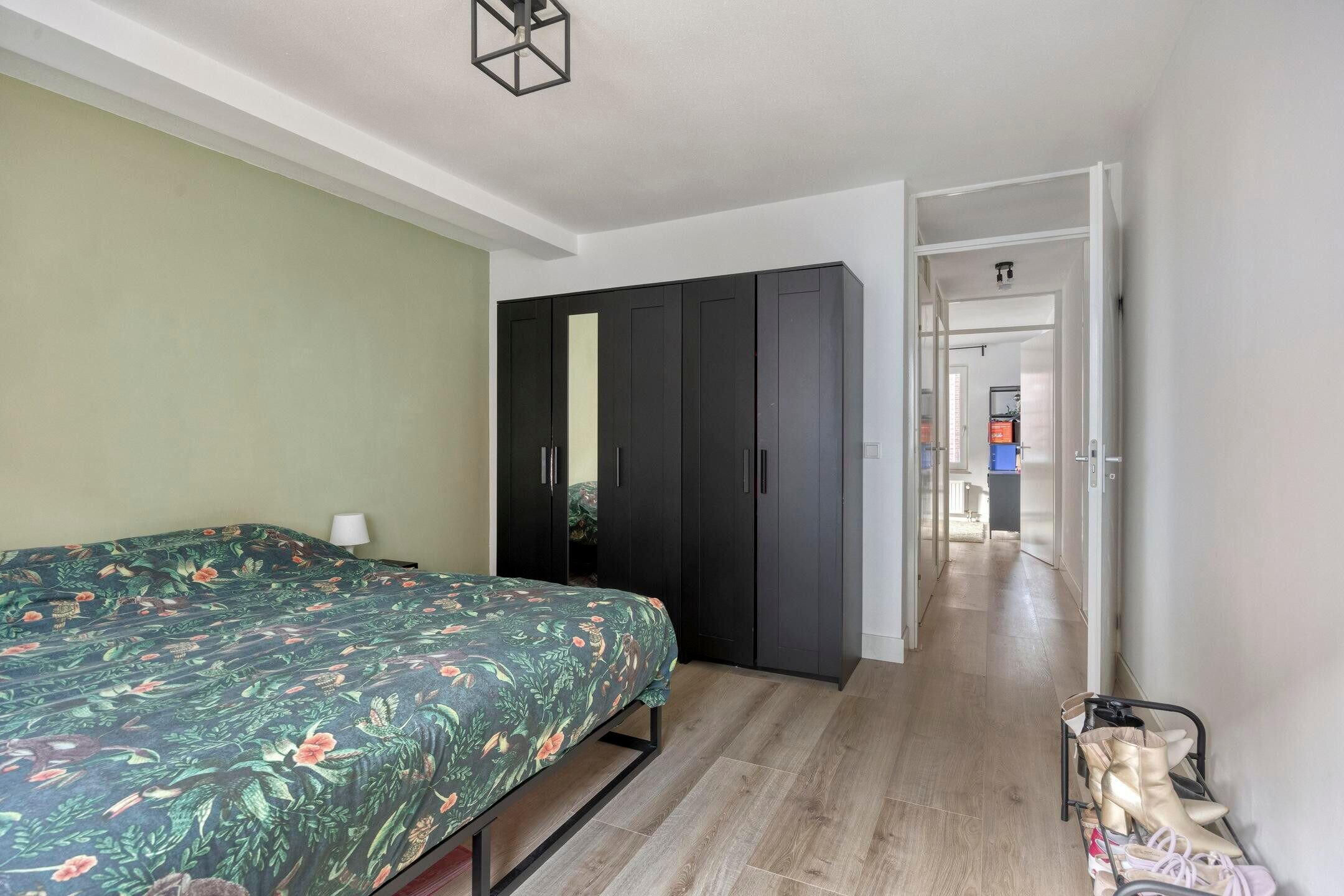 Het rechterdeel van het appartement biedt ruimte aan twee royale slaapkamers, de badkamer en een aparte toiletruimte. Zowel de toiletruimte als de badkamer is vernieuwd, met grote wand-/vloertegels en modern sanitair. In de badkamer heb je de beschikking over een royale douche met glazen wand, een wastafelmeubel en een spiegel met verlichting.